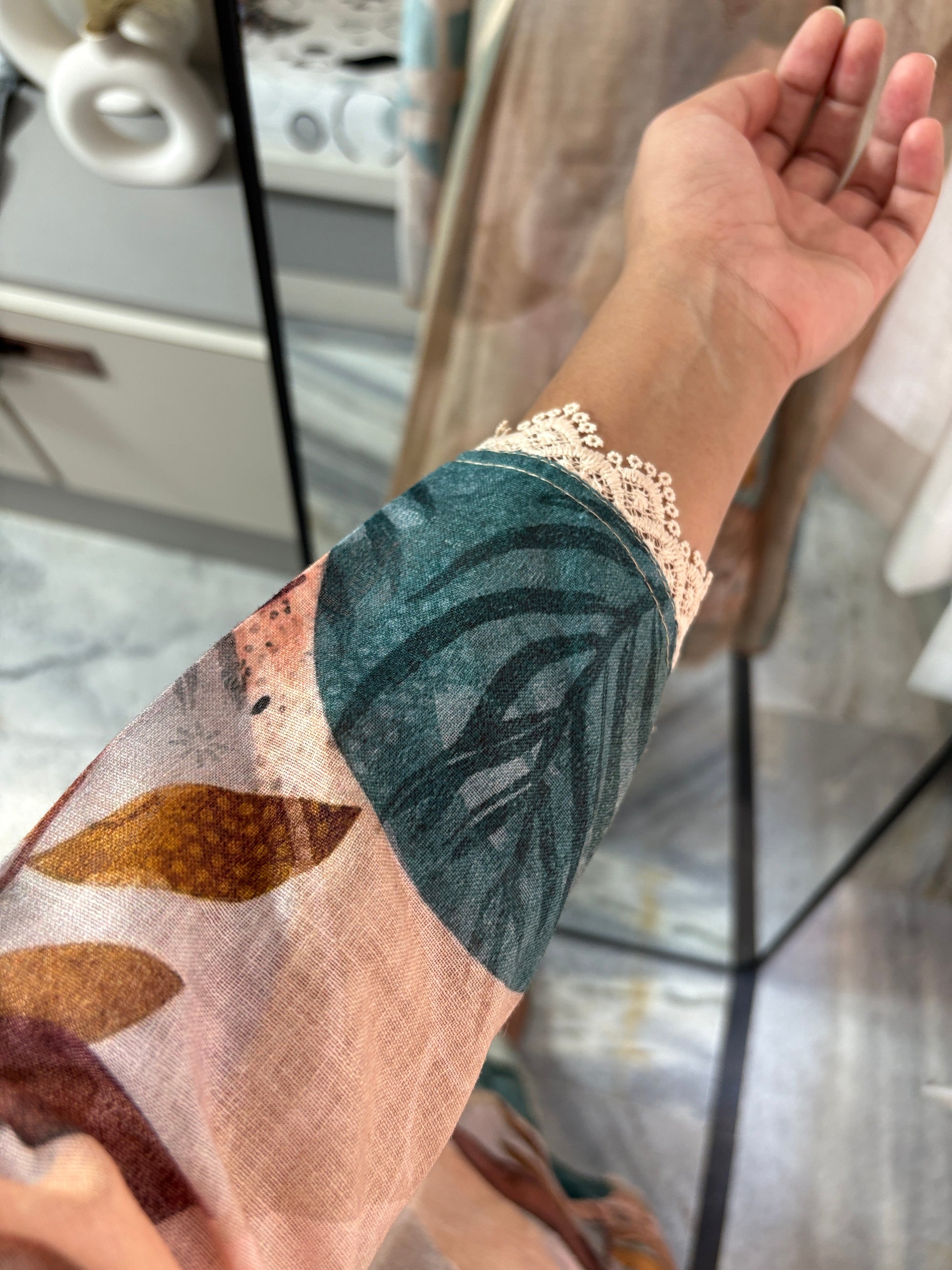 Elegant mirror and thread work on the neckline, paired with an A-line kurti featuring closed slits and comfortable pants. Crafted in pure cotton fabric and styled with a beautiful dupatta for a timeless, graceful look.