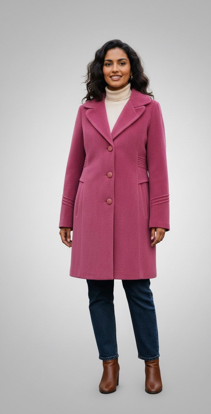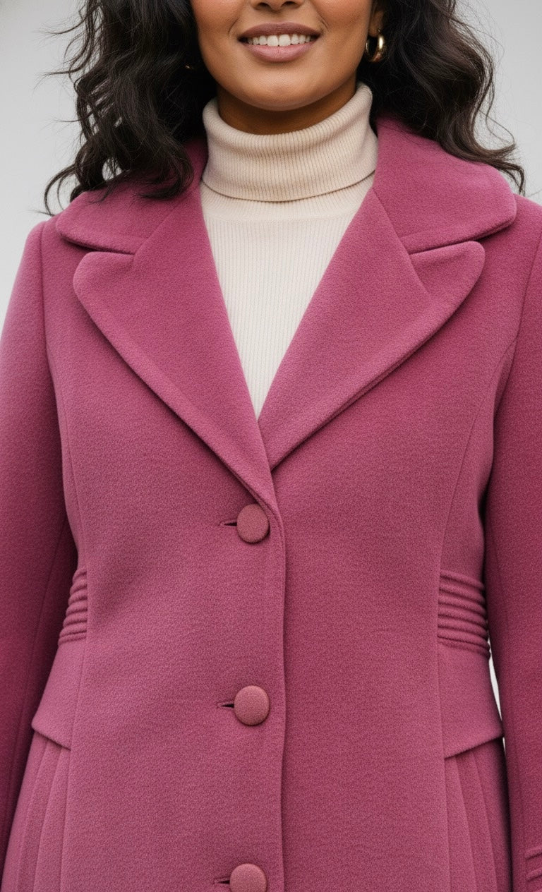 Stay effortlessly elegant this winter in our Blush Wool Overcoat. Crafted in a rich rose hue, this piece blends warmth with sophistication. Designed with a tailored fit, classic lapel collar, and covered buttons, it adds a refined touch to any outfit, from casual denims to formal layers.