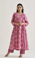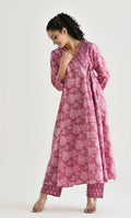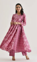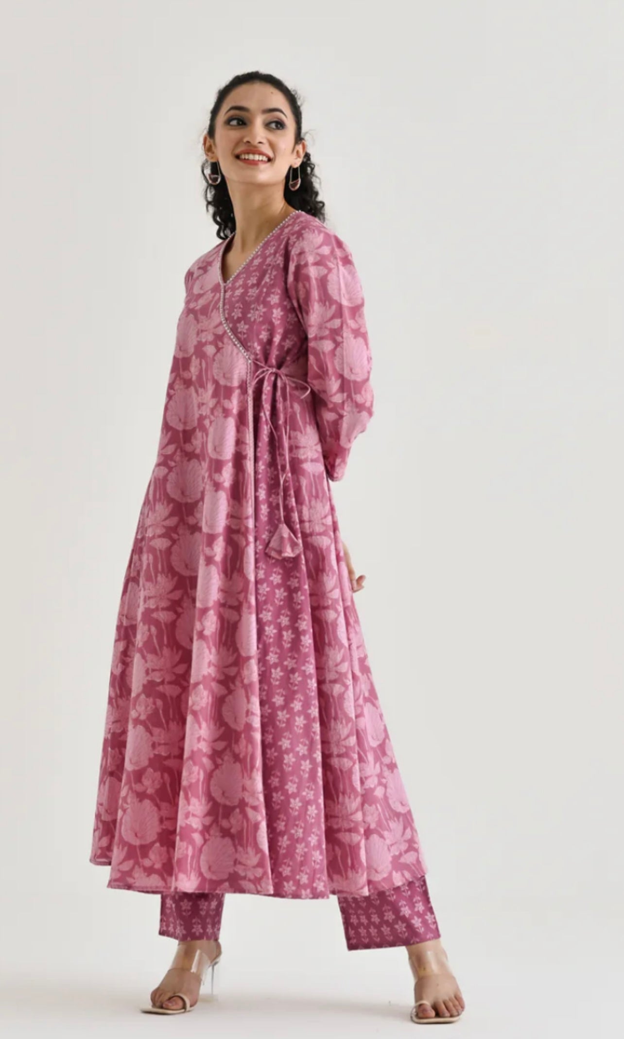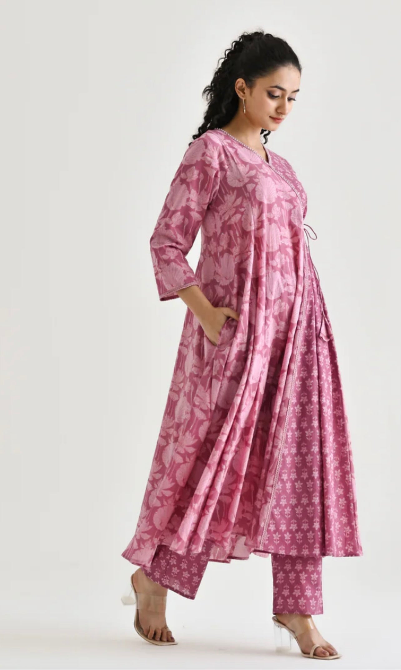 Step into effortless elegance with our pink angrakha-style Anarkali suit, beautifully adorned with delicate hand block prints that celebrate age-old artistry.