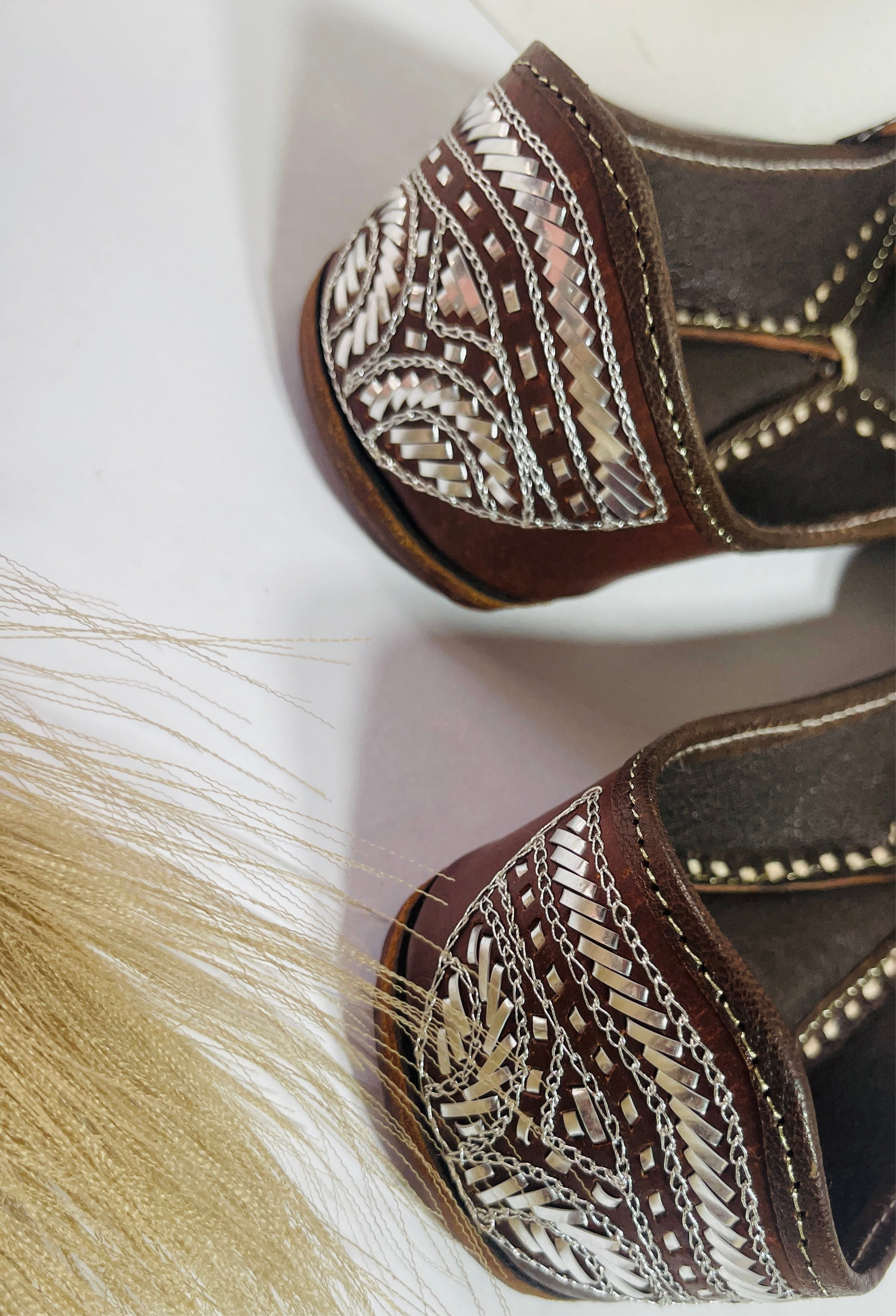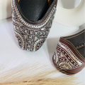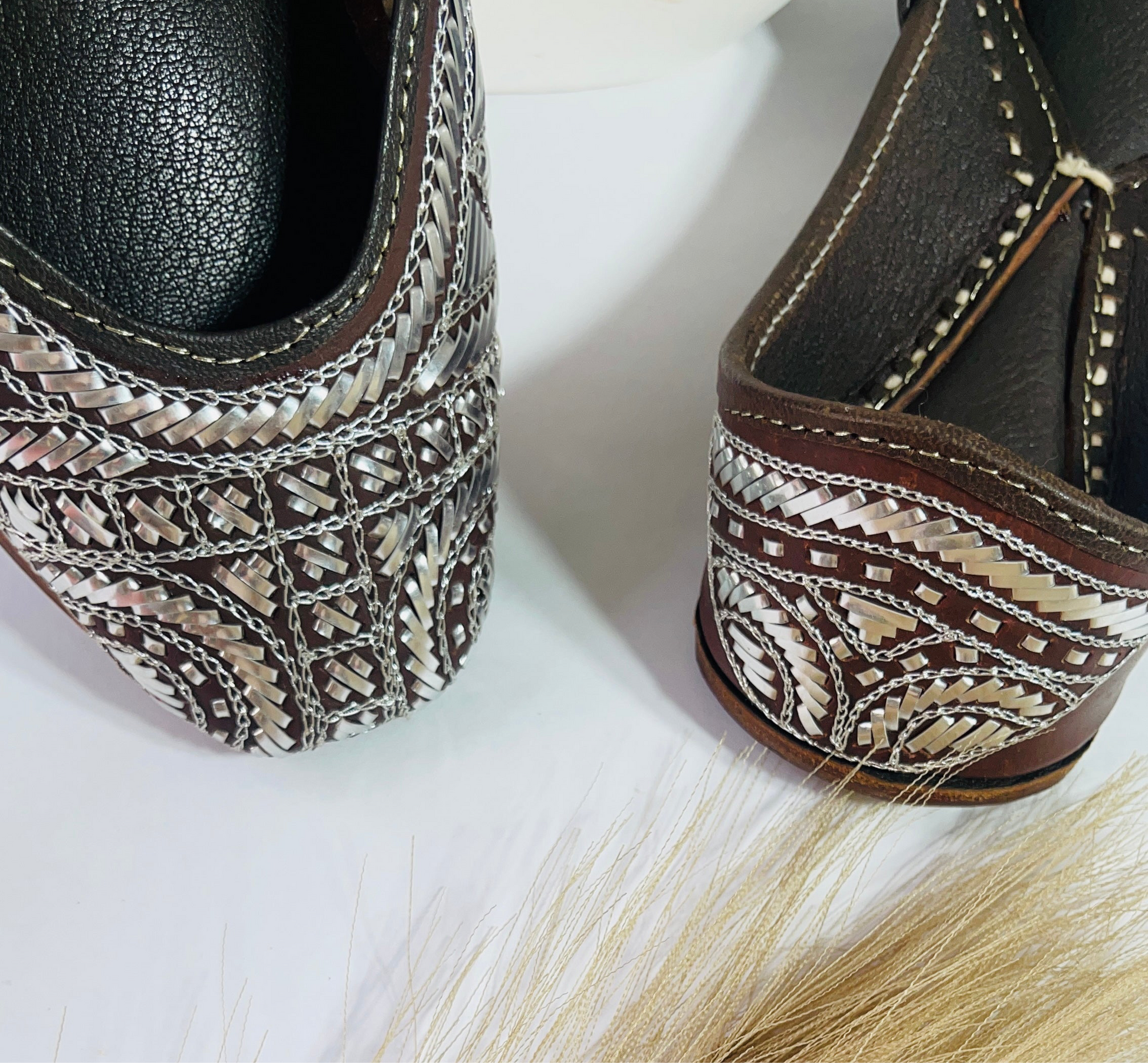 These handcrafted juttis blend traditional artistry with a contemporary edge, perfect for festive occasions or adding a hint of shimmer to everyday elegance.