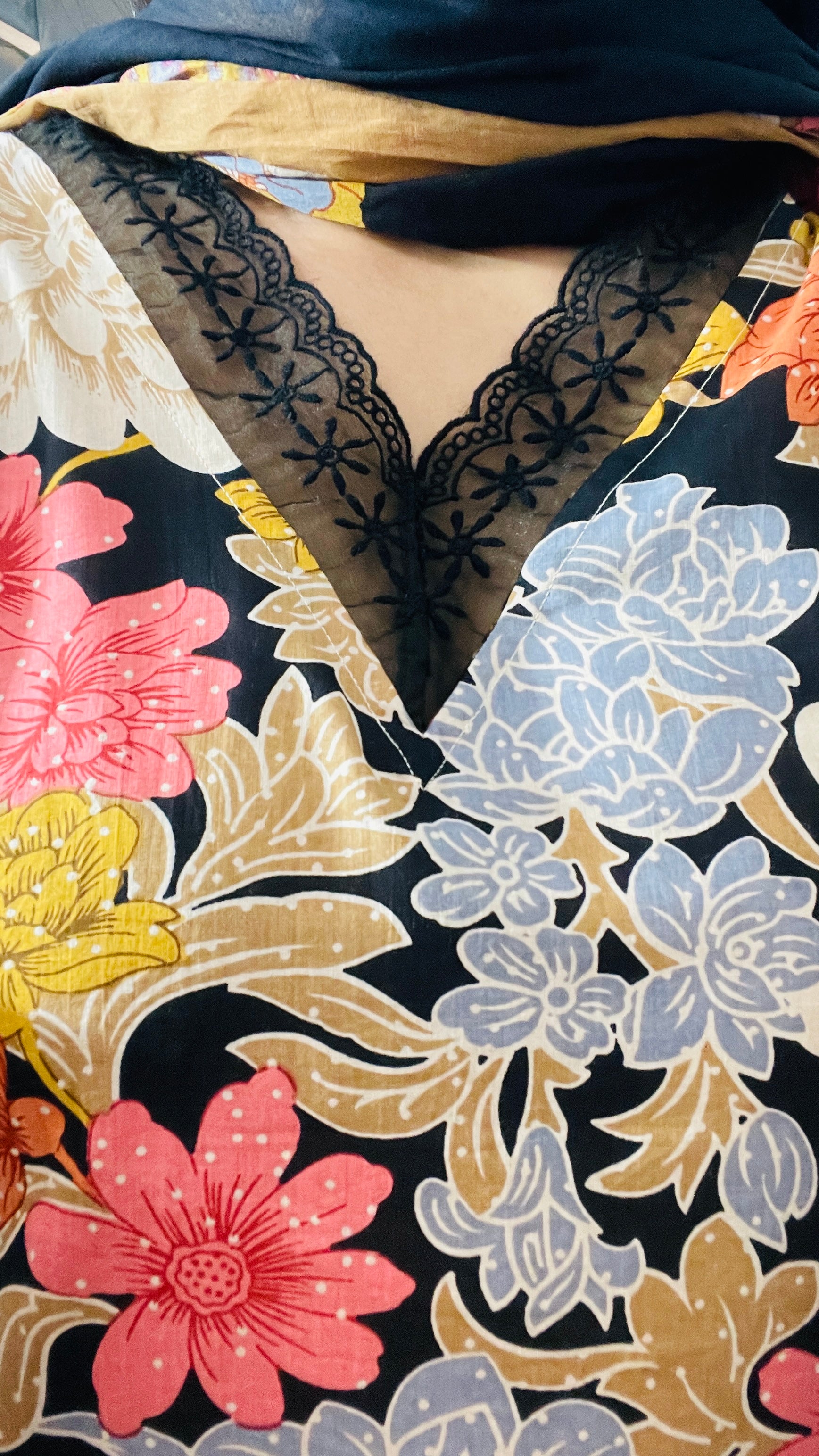 • Featuring a refined V-neck that enhances the silhouette, full sleeves for a modest yet sophisticated touch, and intricate black cotton lace detailing for added charm.