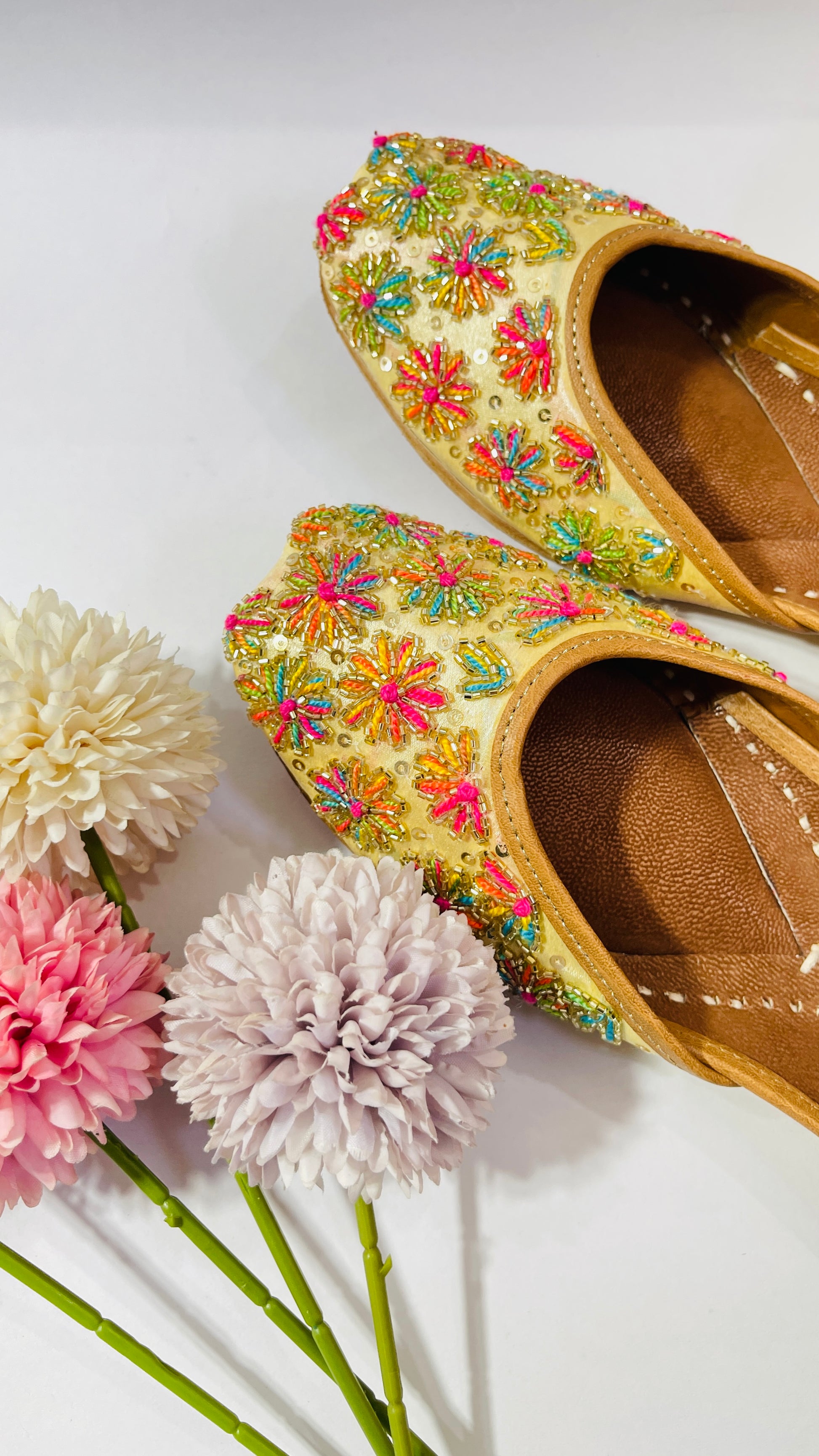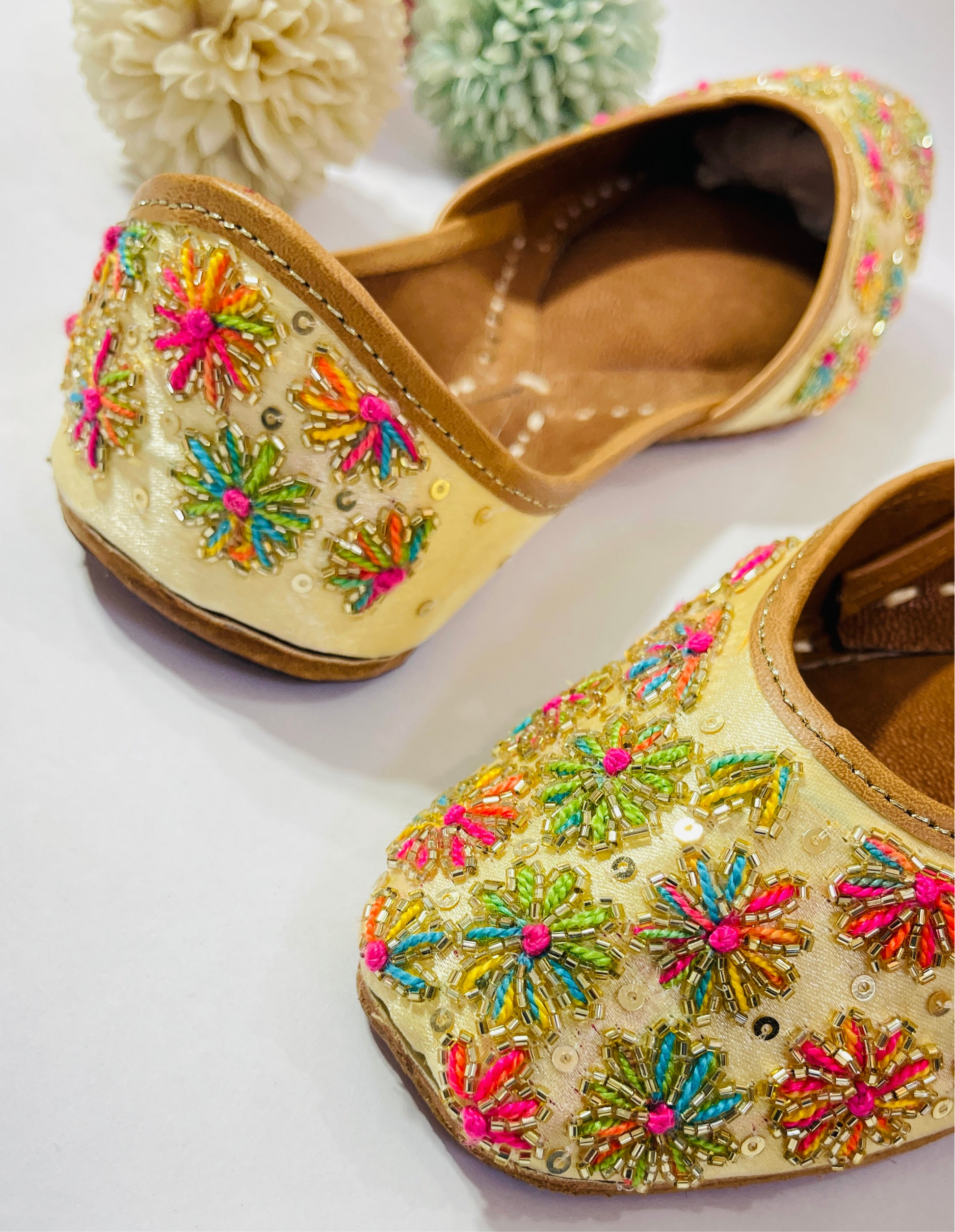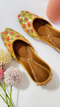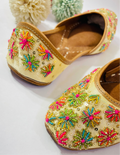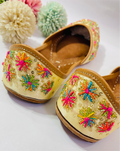 Elevate your festive style with this exquisite golden jutti, meticulously handcrafted with vibrant floral embroidery and delicate sequin embellishments.
