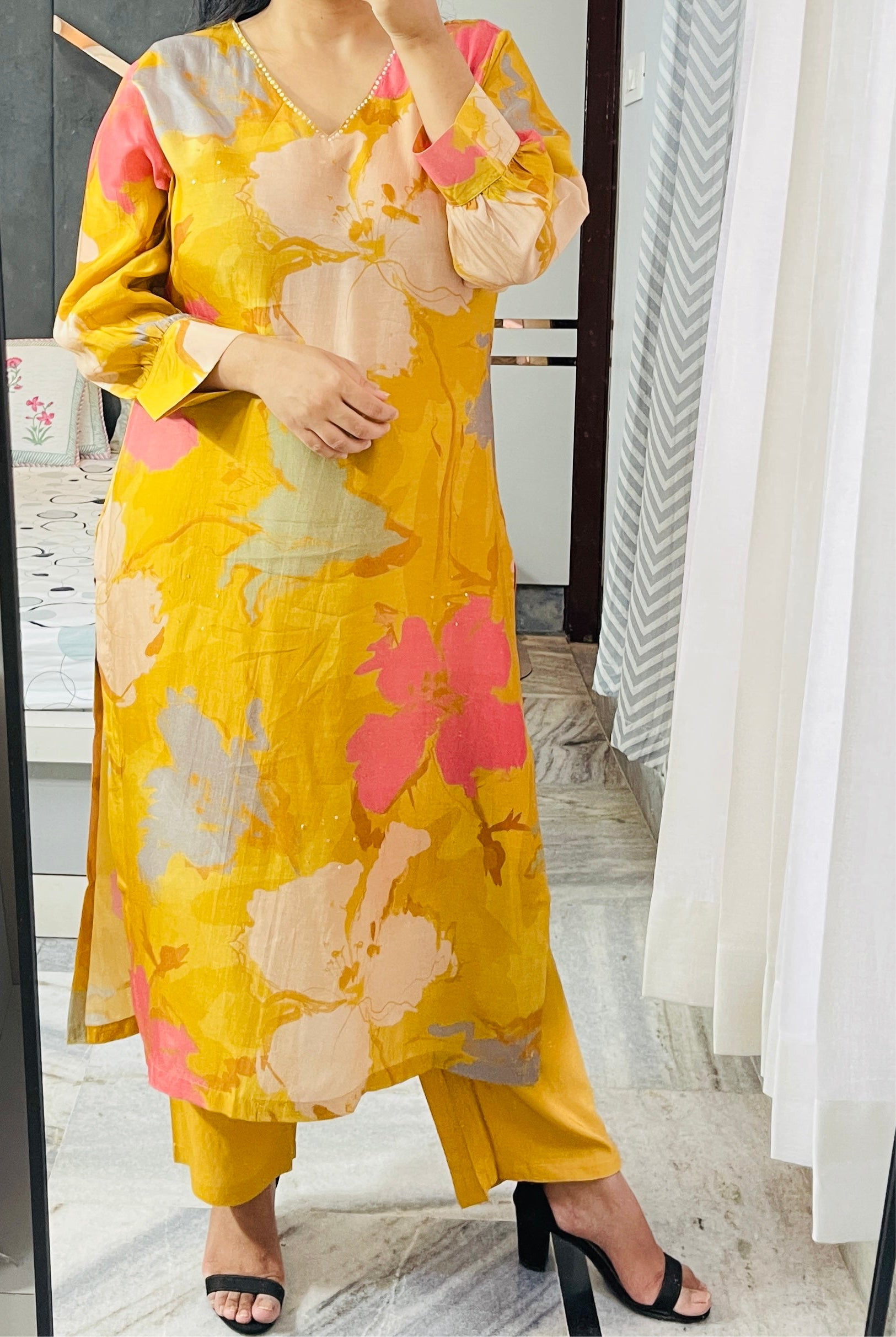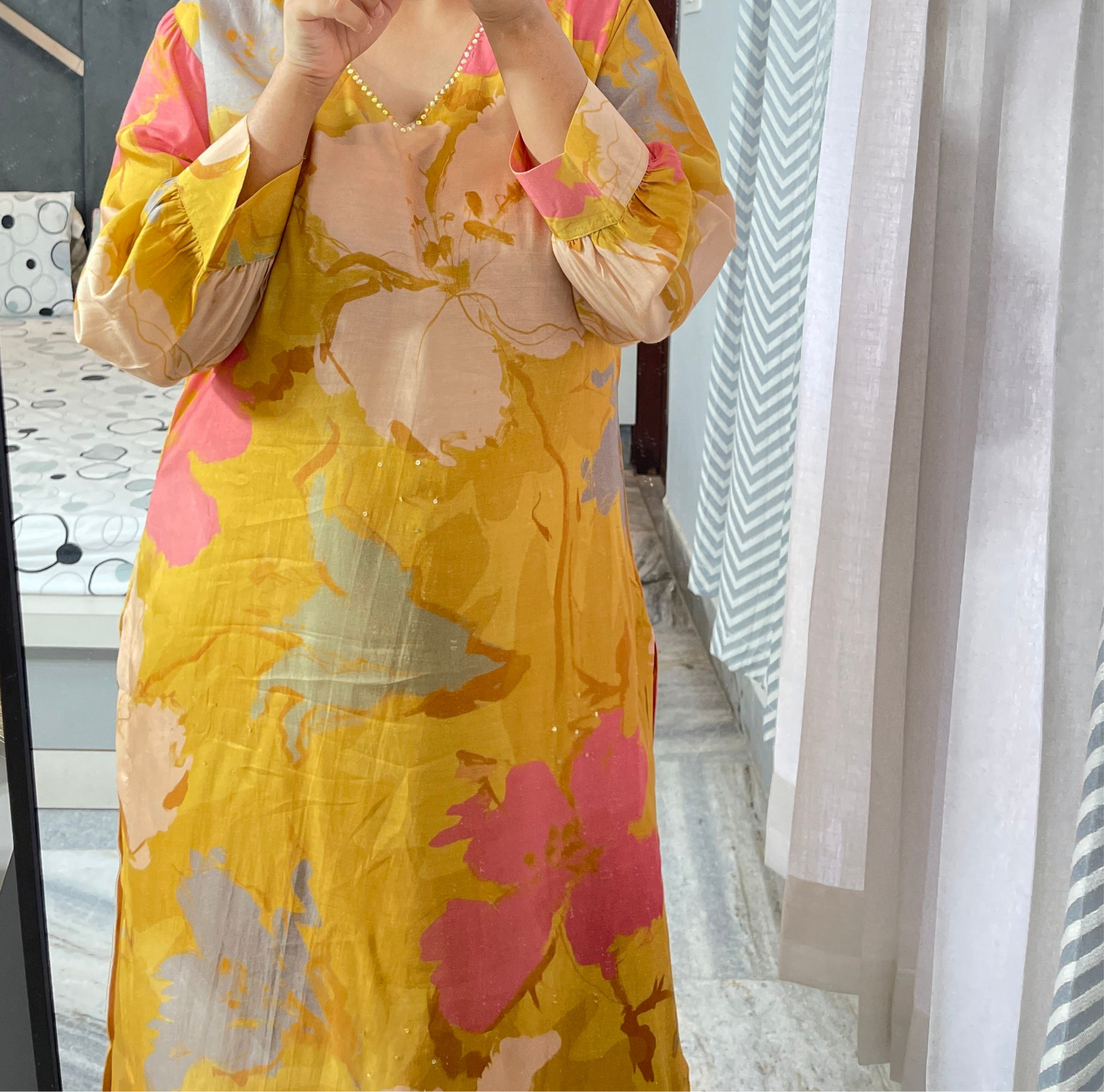 This floral print kurta set, featuring subtle sequin work on the V-neck, is your go-to for everyday elegance. Light, breezy and effortlessly stylish !!