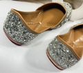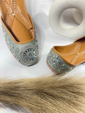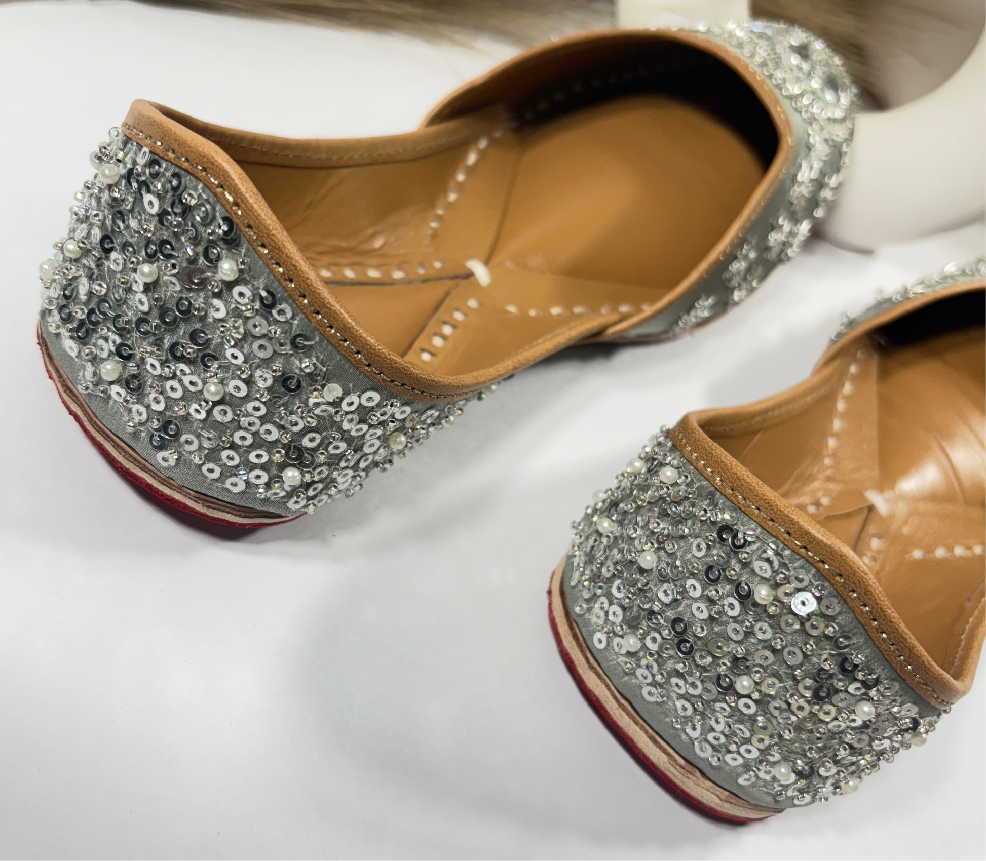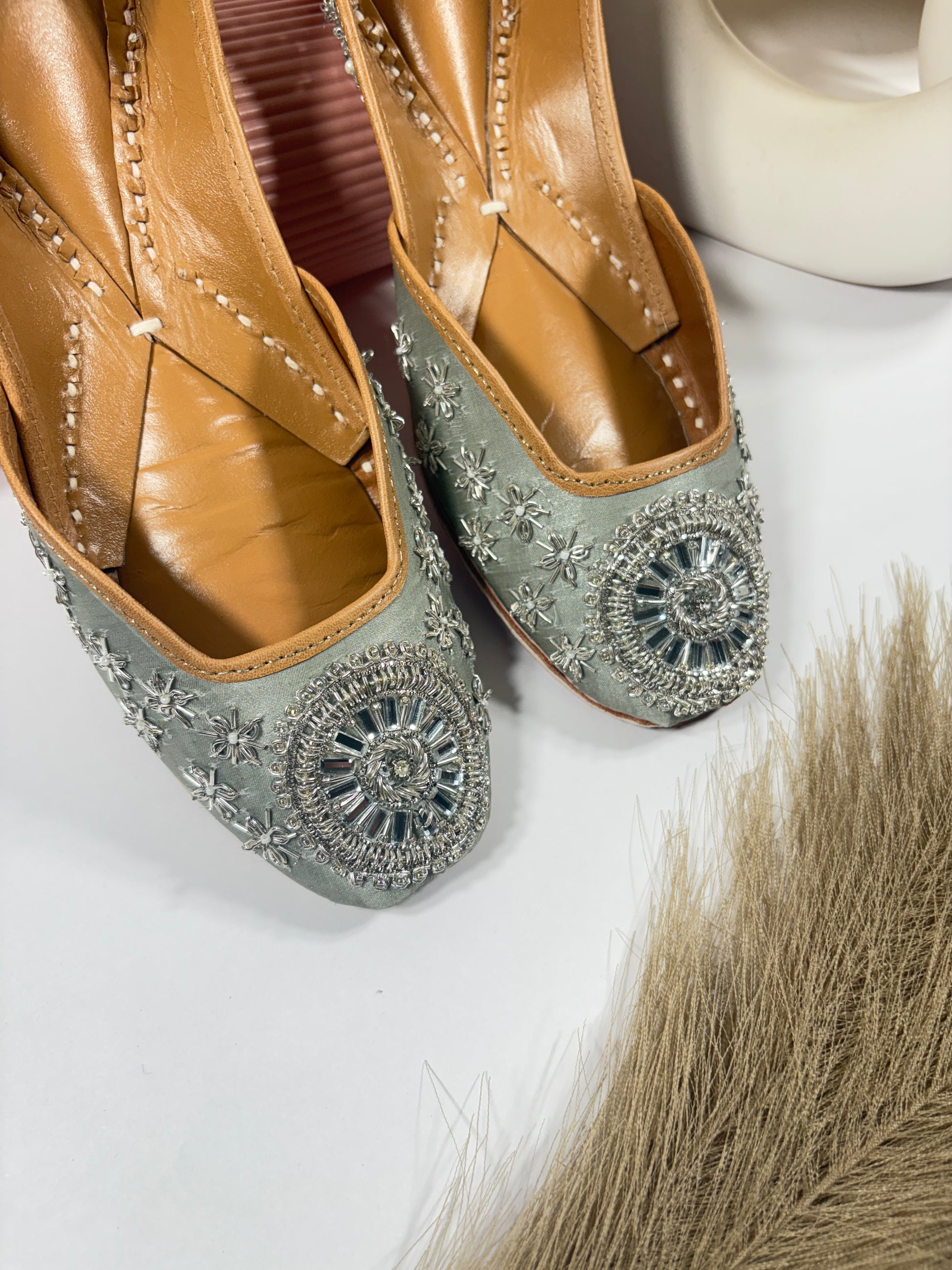 - A statement of understated glamour, this grey jutti is hand-embellished with intricate mirror and beadwork radiating around a striking central motif.
