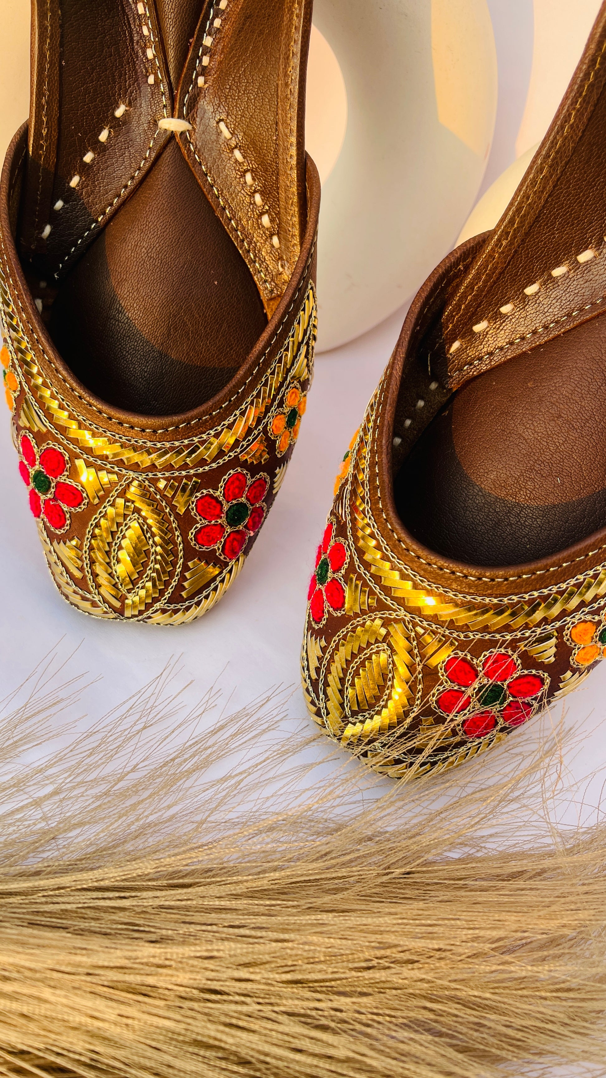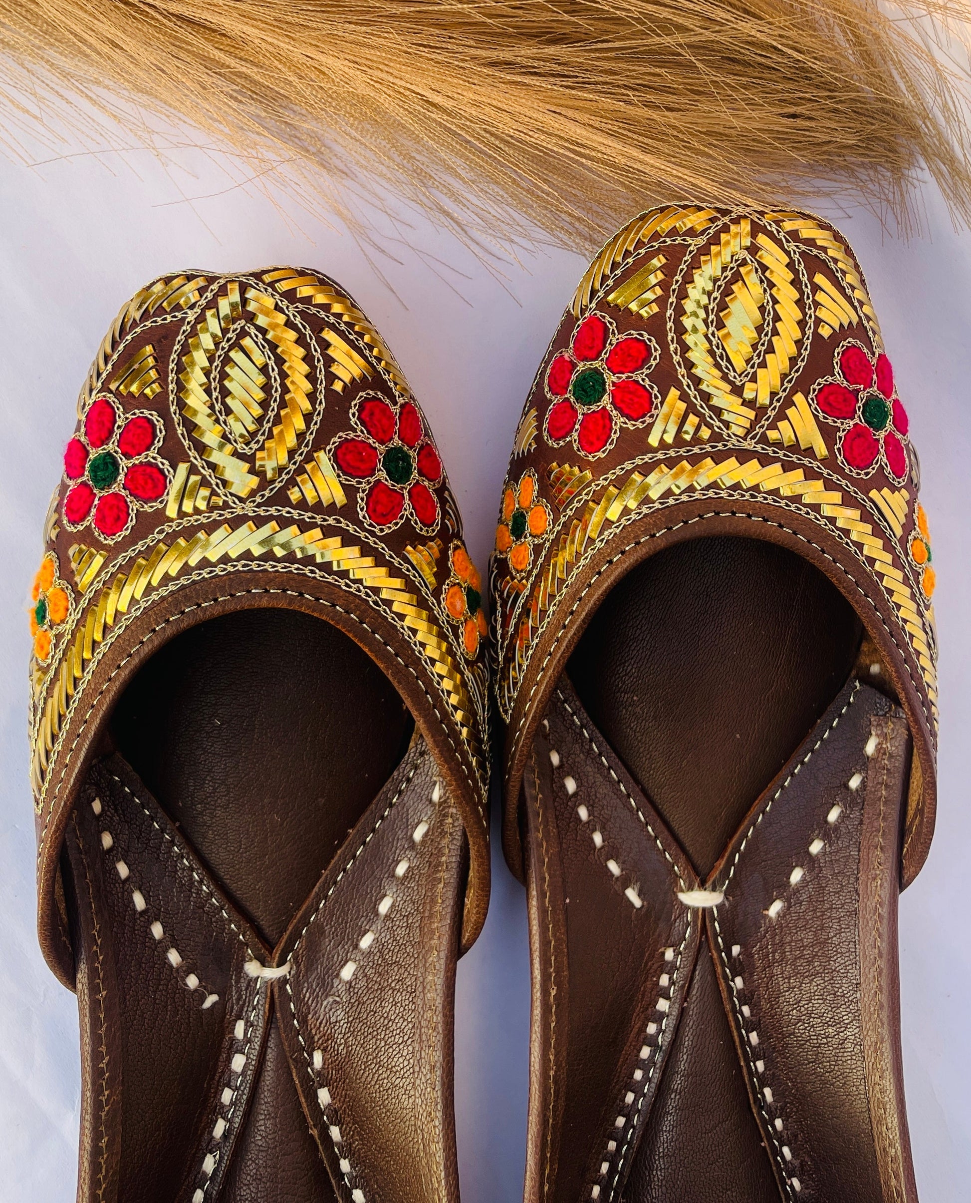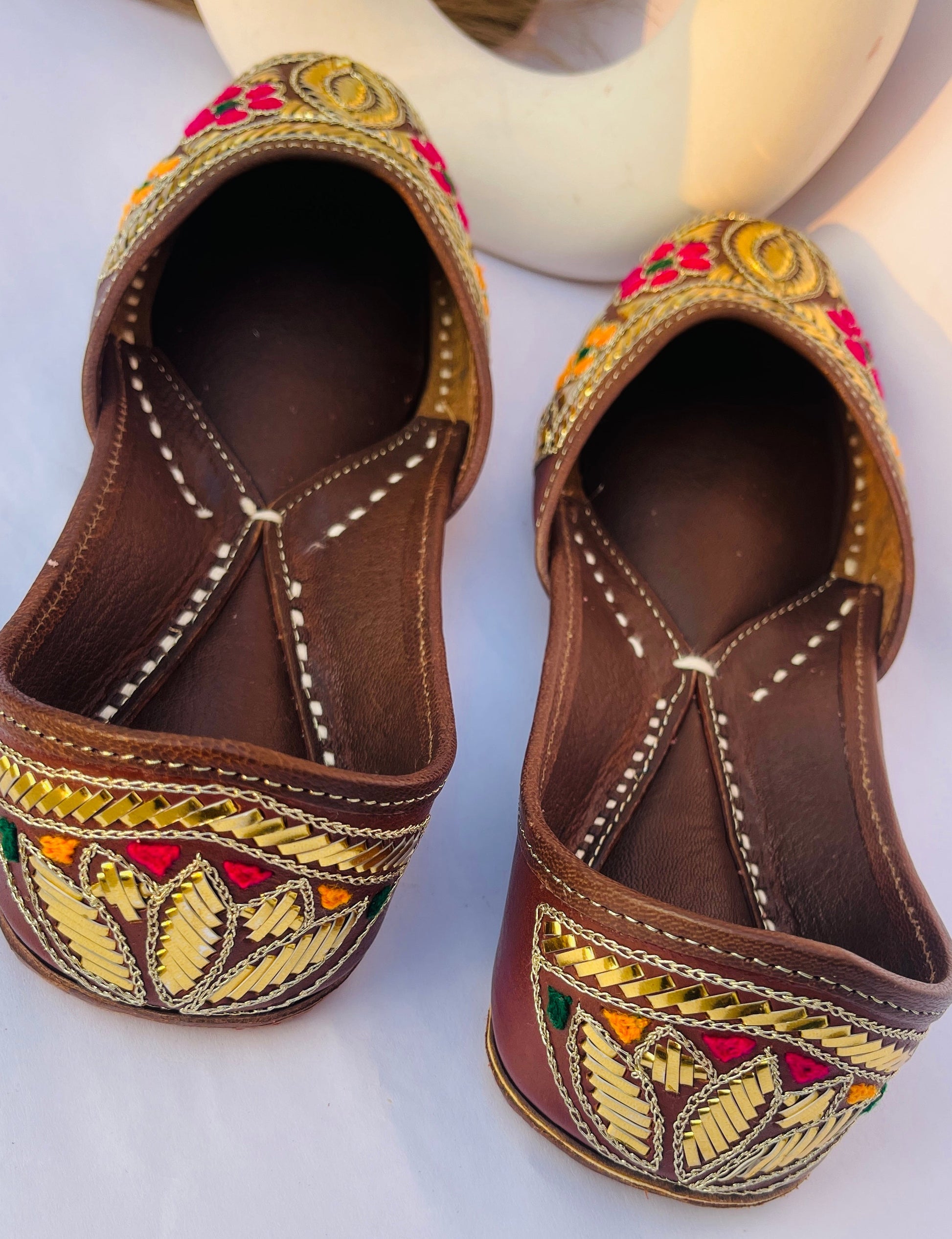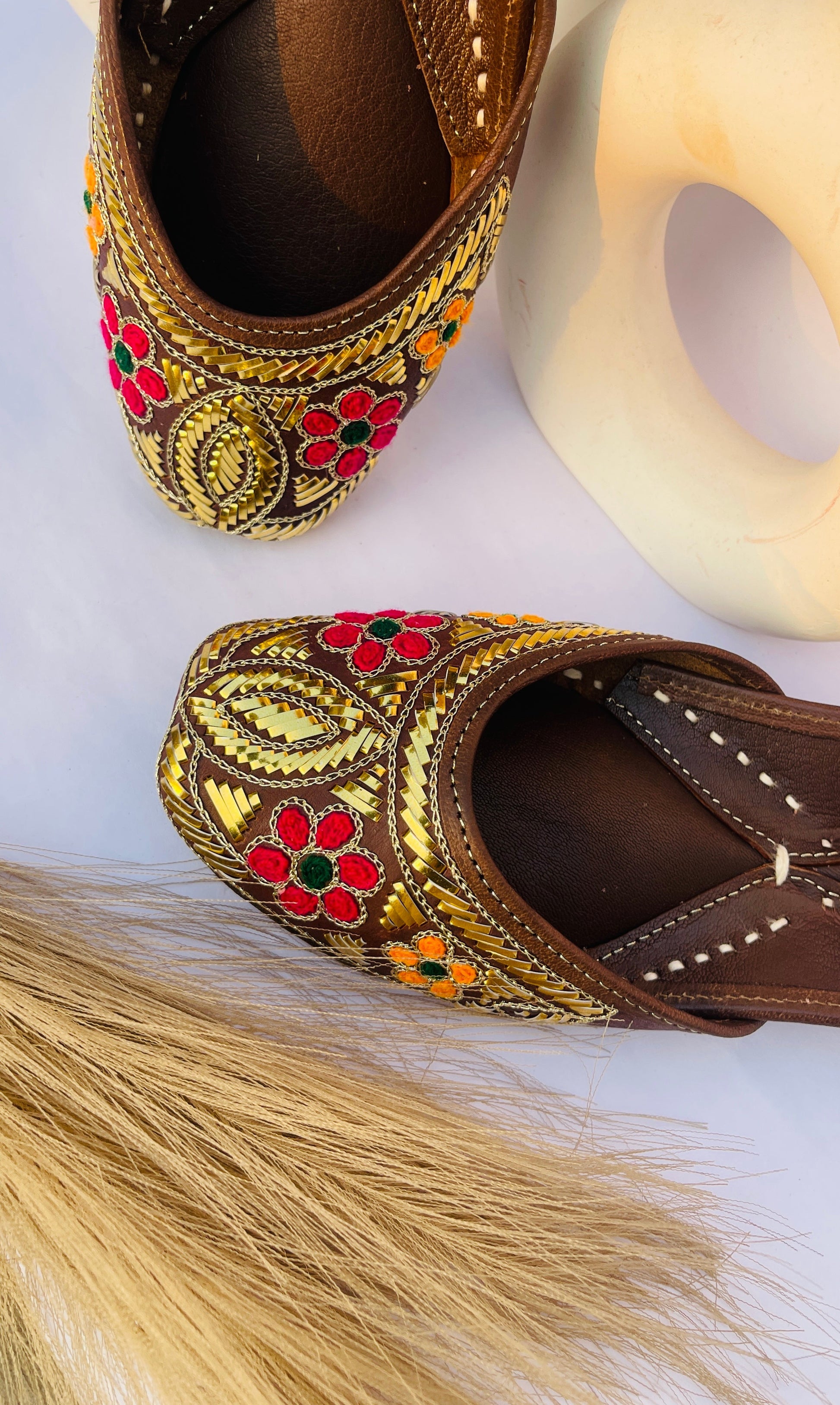 Crafted on rich brown leather, it brings together comfort, craftsmanship and festive elegance perfect for weddings, mehendi, or elevating any ethnic outfit.