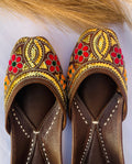 A stunning blend of tradition and shine, this jutti features intricate gold mukaish work paired with bright hand embroidered florals.