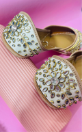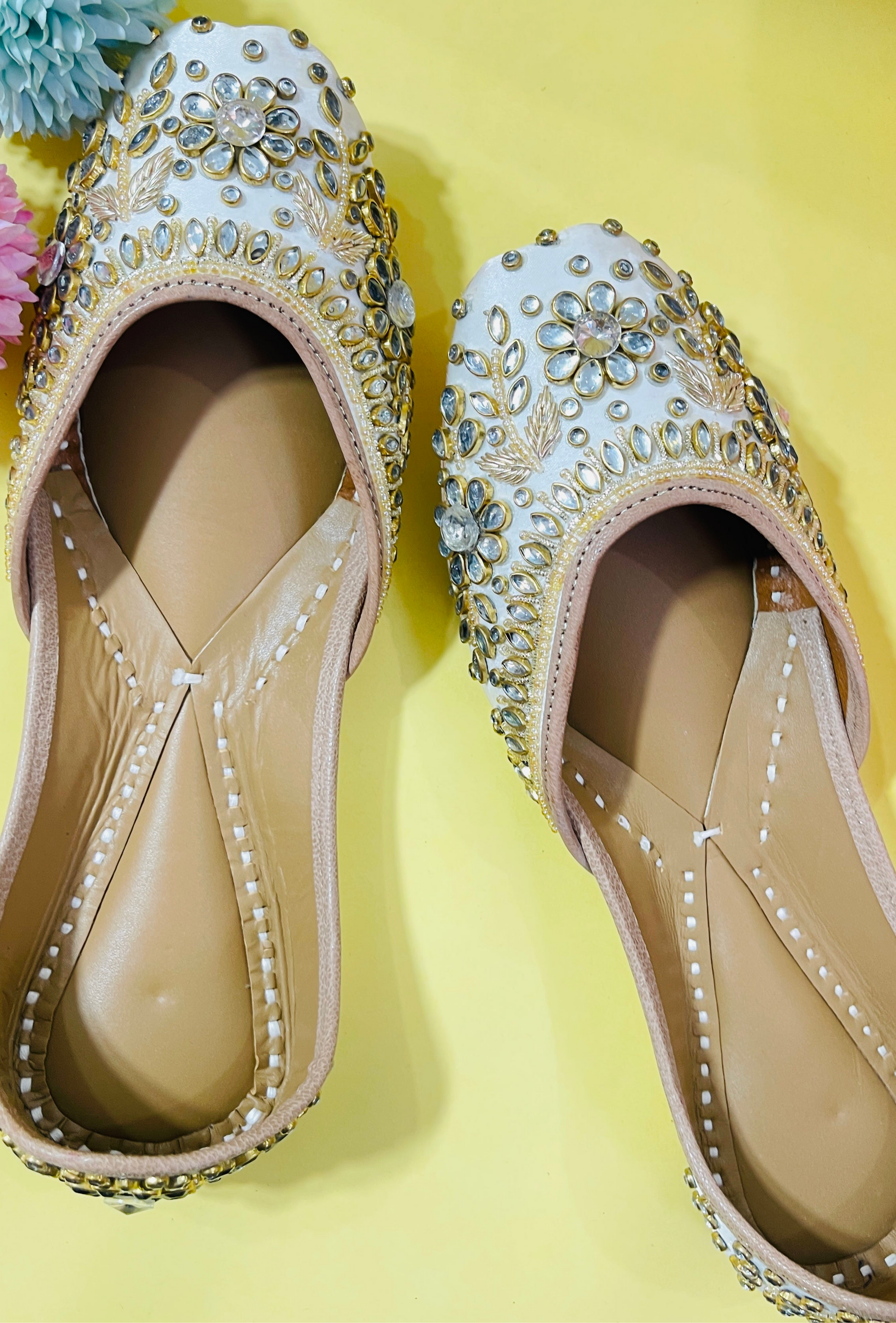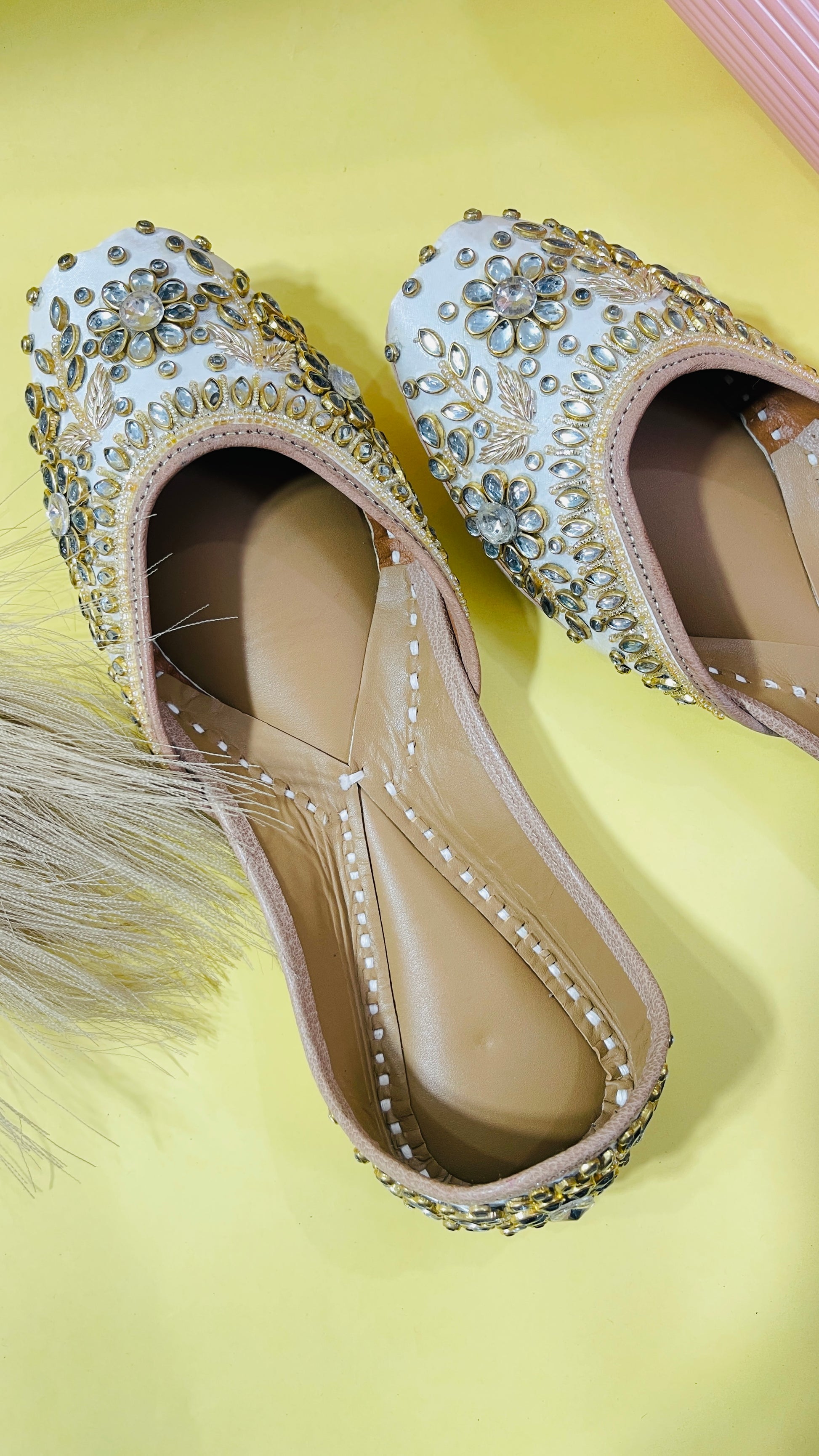 Indulge in royal sophistication with this cream base jutti, richly adorned with intricate kundan work.