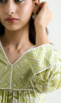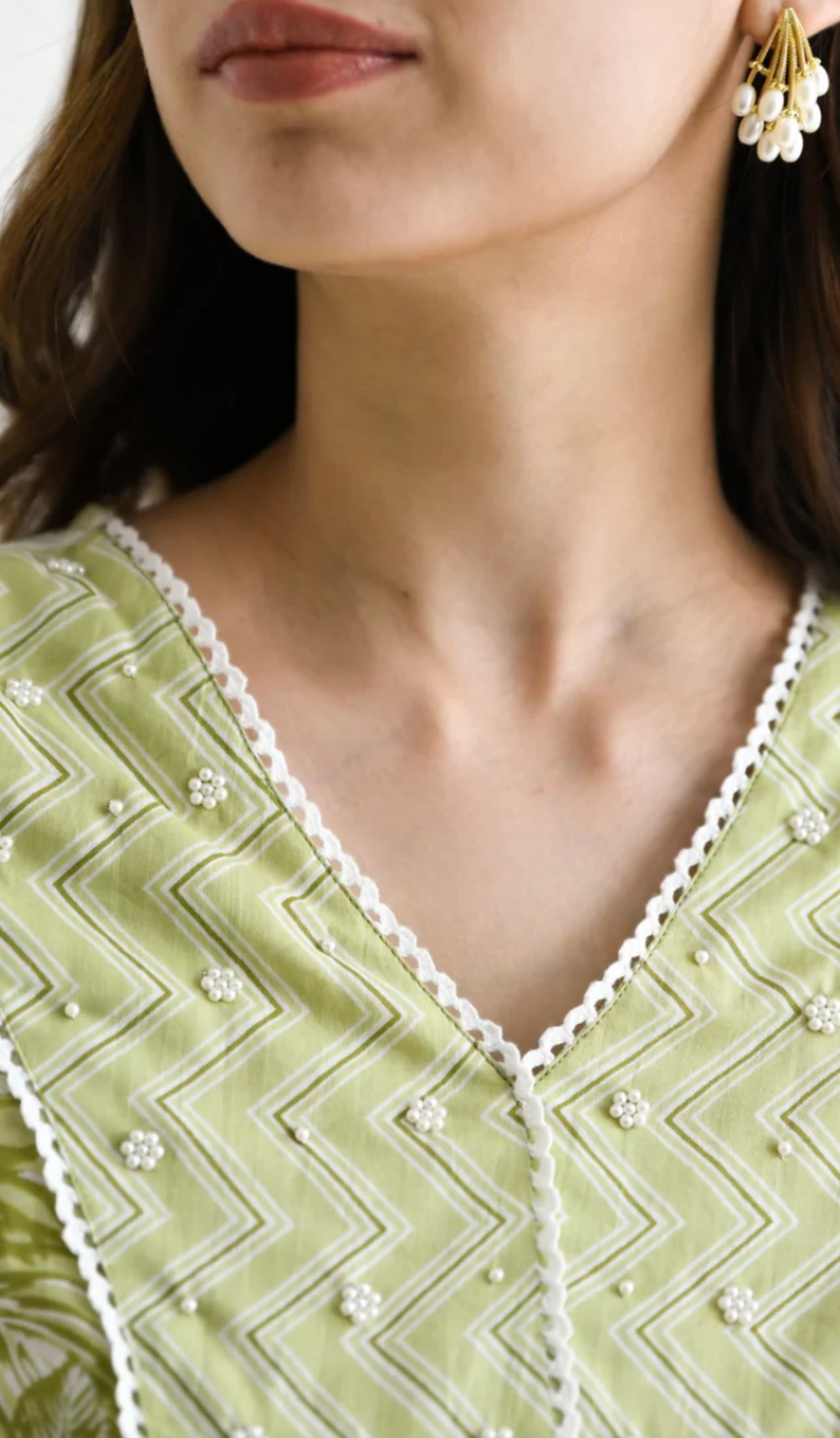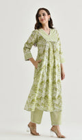Step into effortless grace with this light green flared kurta set, crafted in breathable cotton and adorned with delicate leafy prints. The relaxed silhouette and chevron-print bottoms create a perfect fusion of comfort and chic for sunny days and casual gatherings.