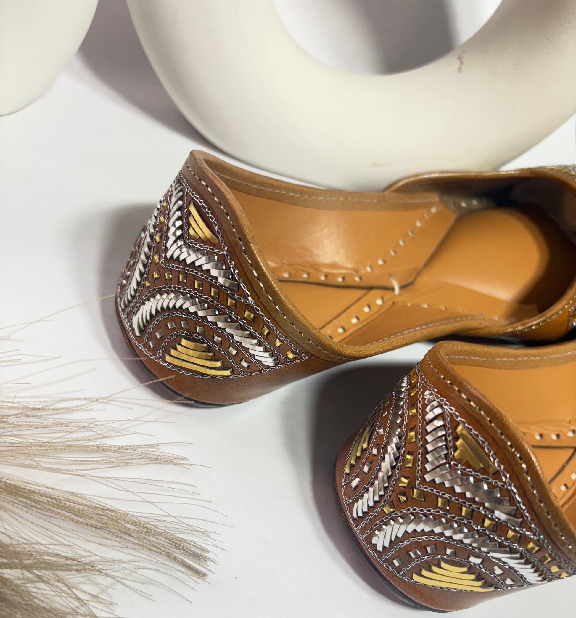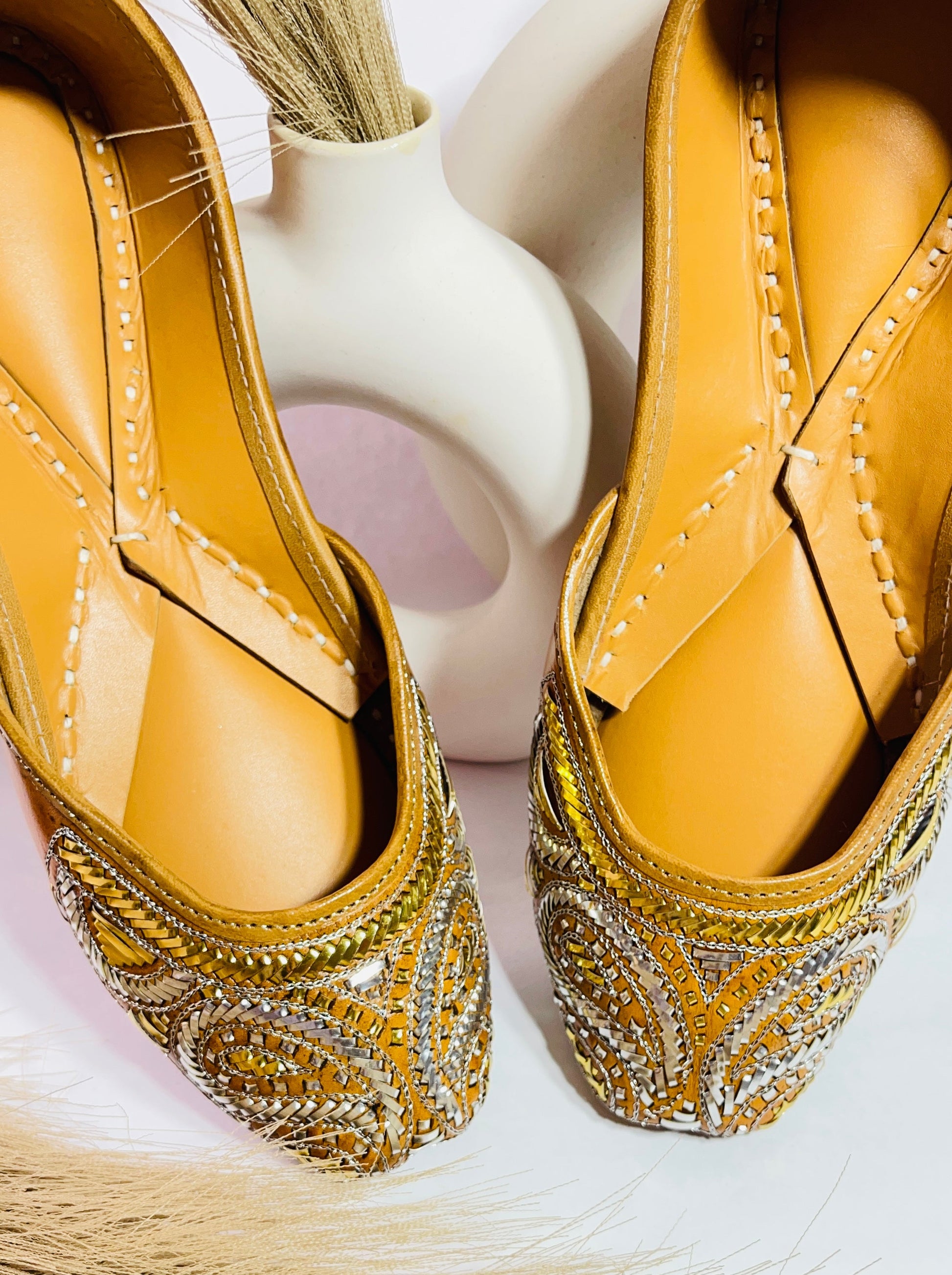 A celebration of tradition and artistry, this jutti features glimmering mukaish work on a tan base. The perfect pair to light up your festive moments.