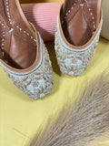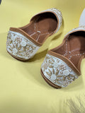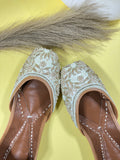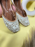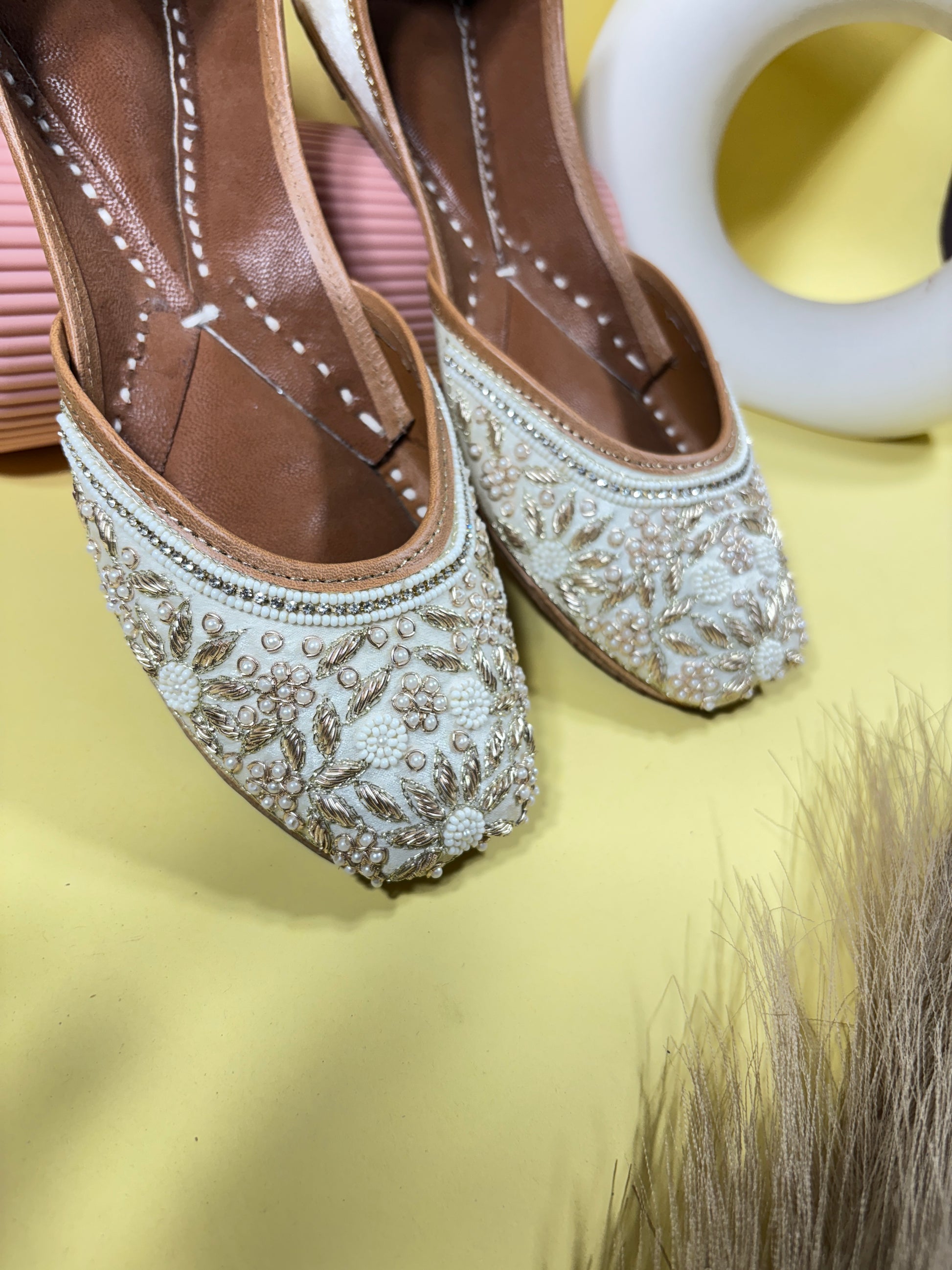 The Noor Juttis are a celebration of timeless artistry and elegance. Handcrafted on an ivory base, they feature delicate pearl beadwork, dabka detailing, and floral motifs stitched with precision. Every embellishment tells the story of skilled craftsmanship, bringing together tradition and modern grace.