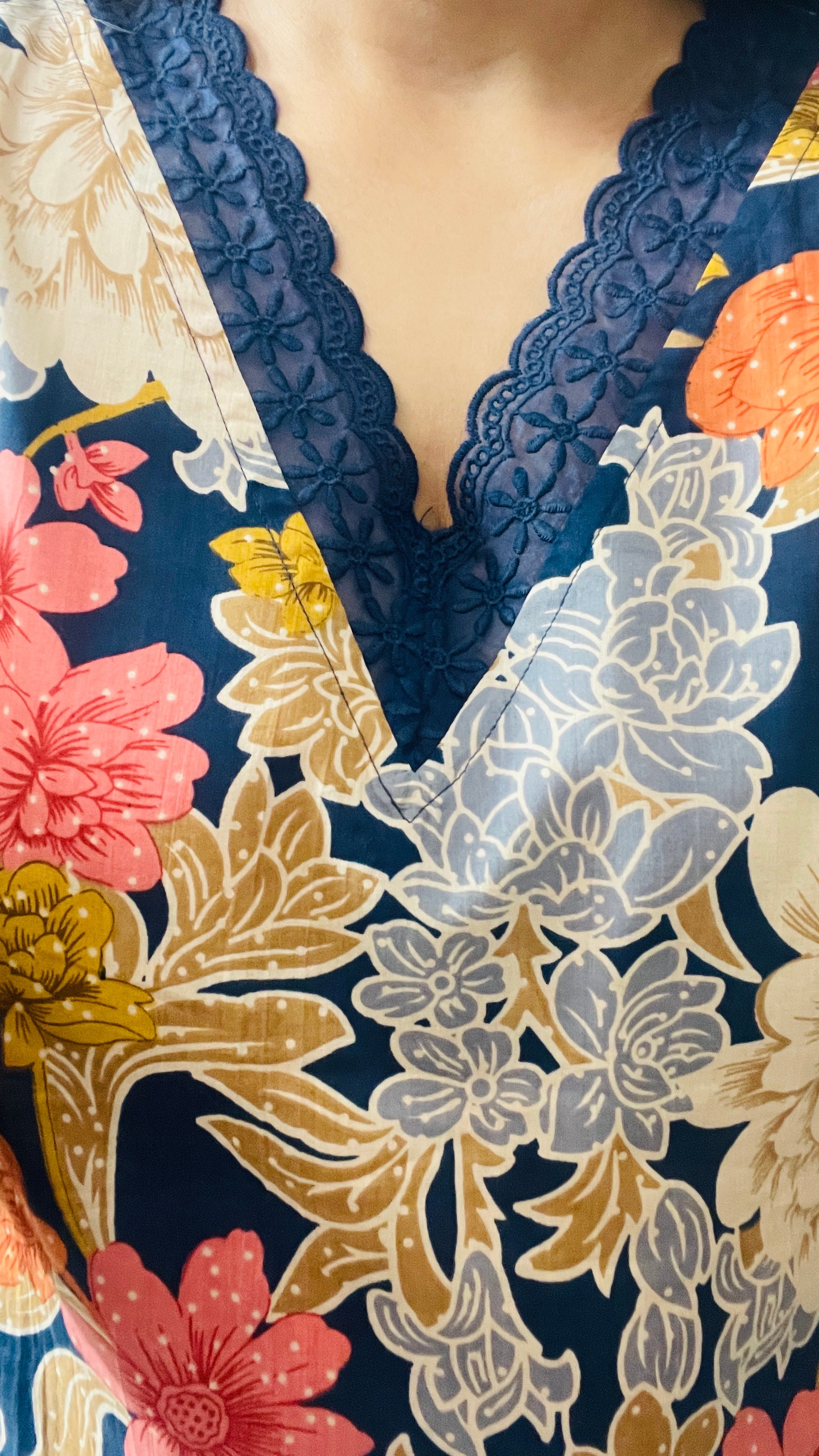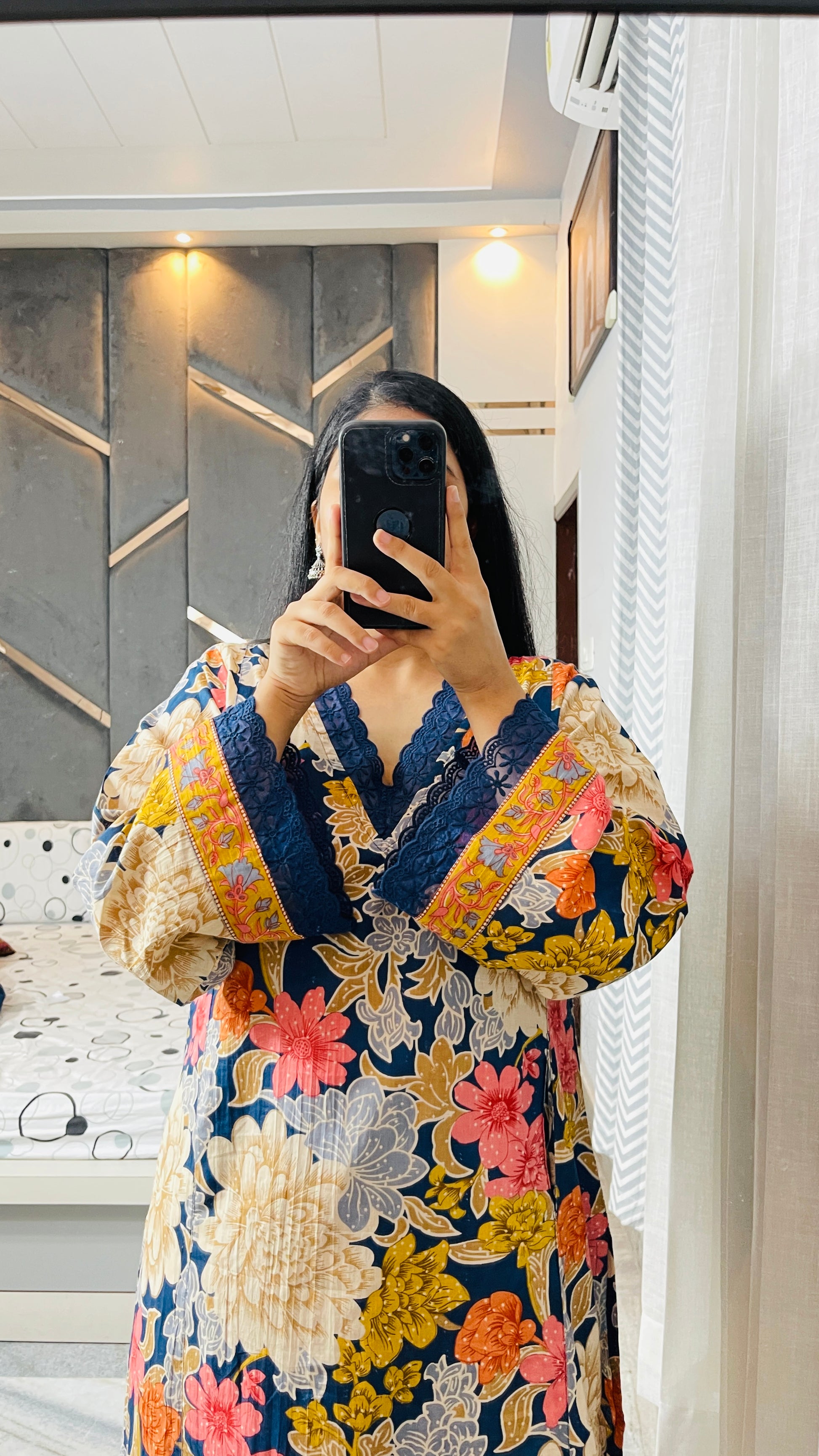 • Featuring a refined V-neck that enhances the silhouette, full sleeves for a modest yet sophisticated touch, and intricate black cotton lace detailing for added charm.