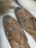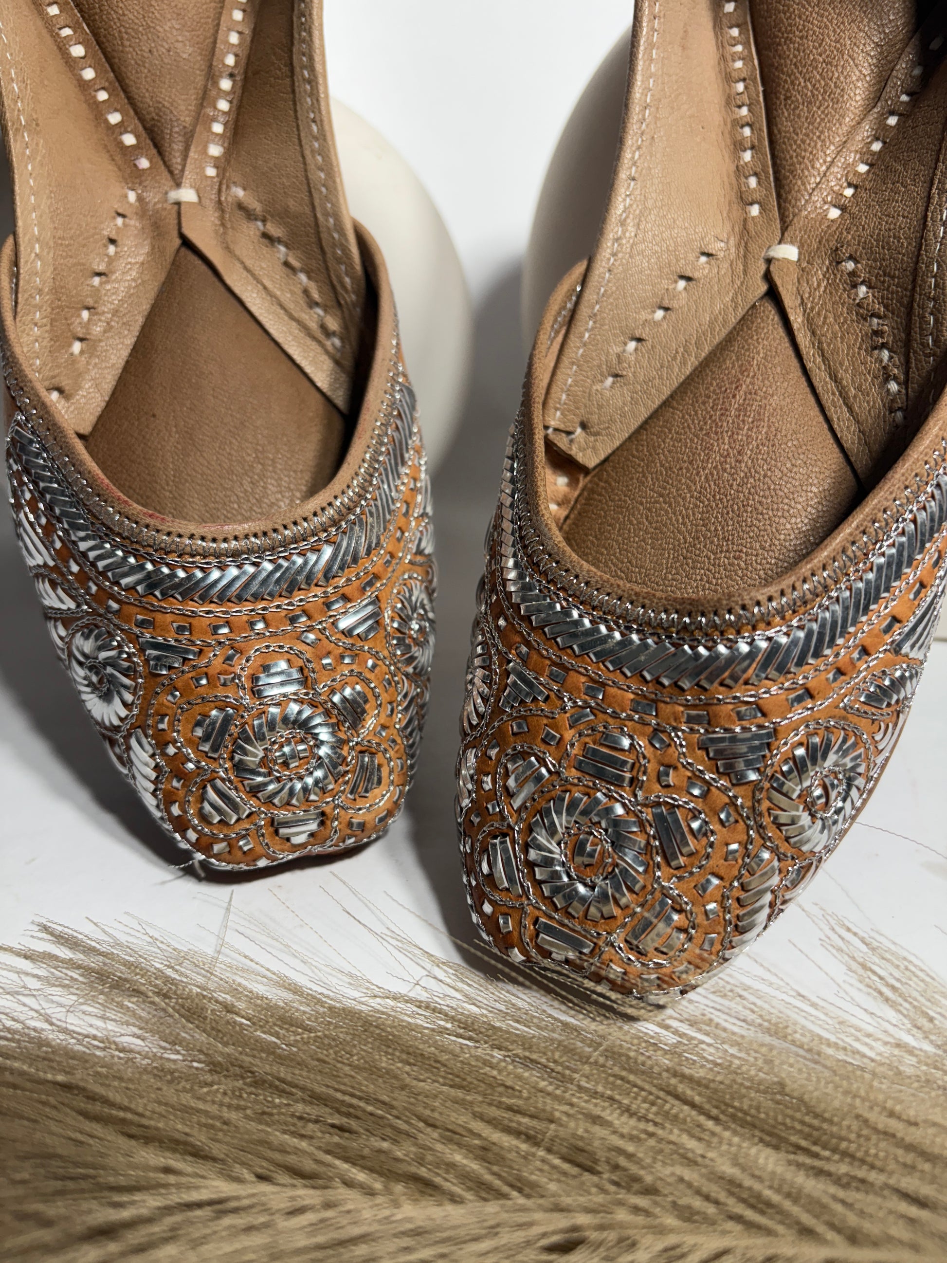 An ode to fine artistry, Tabeer, Silver Mukaish Jutti showcases intricate mukaish work on a soft tan base, exuding understated sophistication.