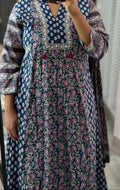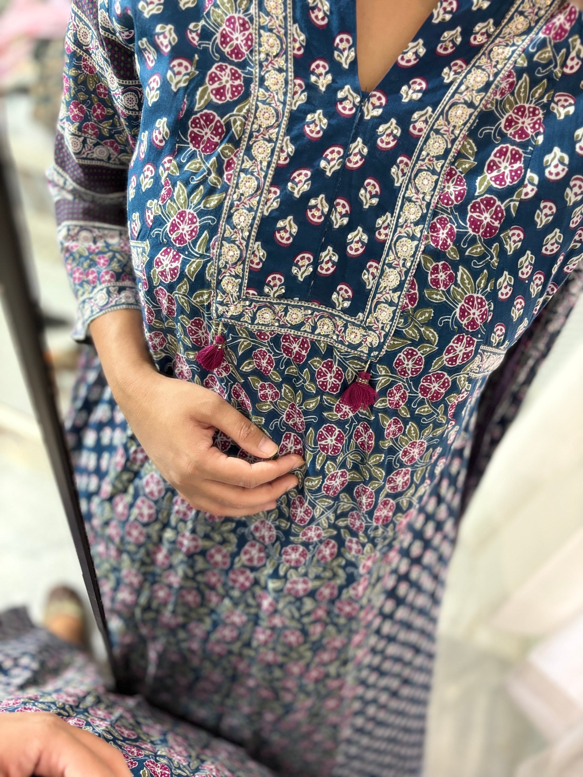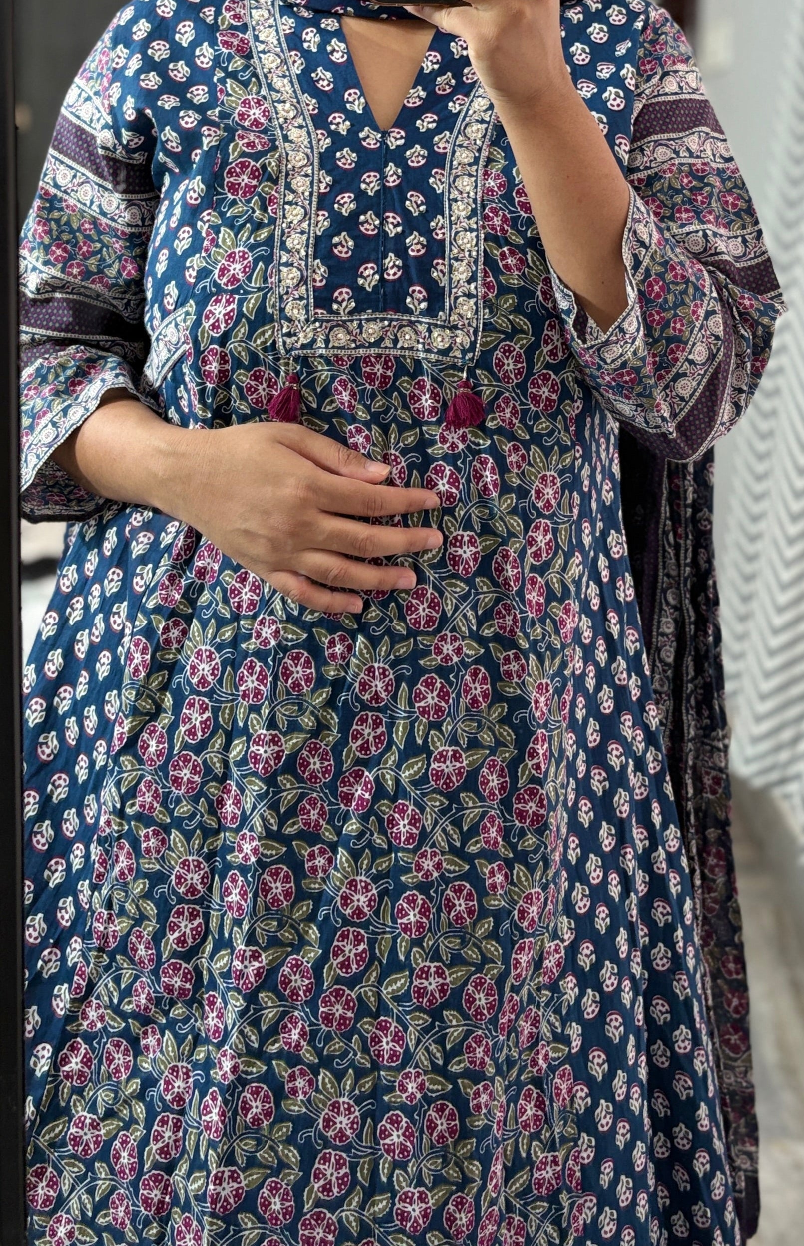 A timeless Anarkali suit set crafted in soft, breathable cotton and adorned with delicate handblock floral prints in rich indigo and wine hues.